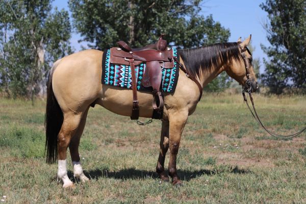 Smoke is a very gentle and fancy buckskin gelding that will turn heads wherever you go. He has been used for all aspects of ranch work. He has drug calves to the fire, sorted, trailed cows, and doctored out in the pasture. He is very sure footed in rough country....More