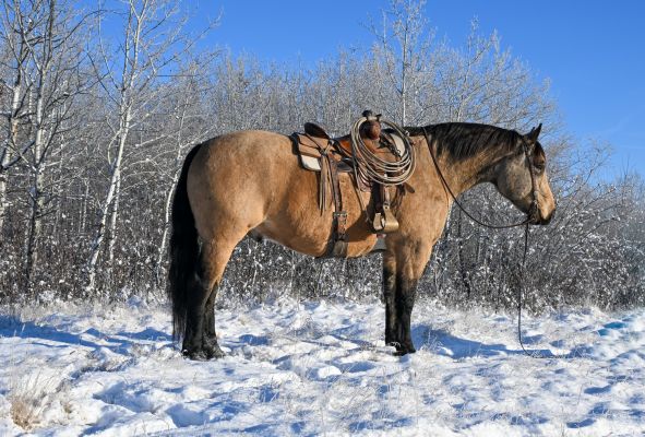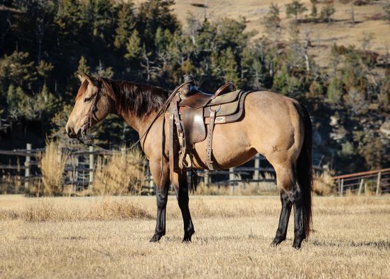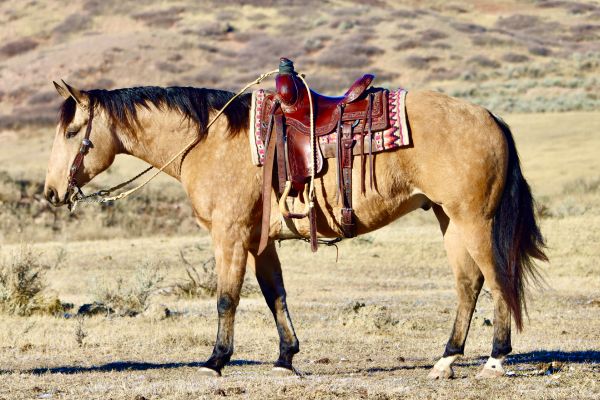 Smoke is a very gentle and fancy buckskin gelding that will turn heads wherever you go. He has been used for all aspects of ranch work. He has drug calves to the fire, sorted, trailed cows, and doctored out in the pasture. He is very sure footed in rough country....More