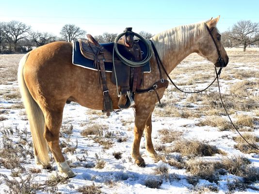 "Bandit" is your perfect sized AQHA gelding that can do it all. A flashy dappled palomino, he's definitely easy to look at. Bandit is one that you can let sit for months at a time and is going to be the same horse when you catch him again. He's the...More